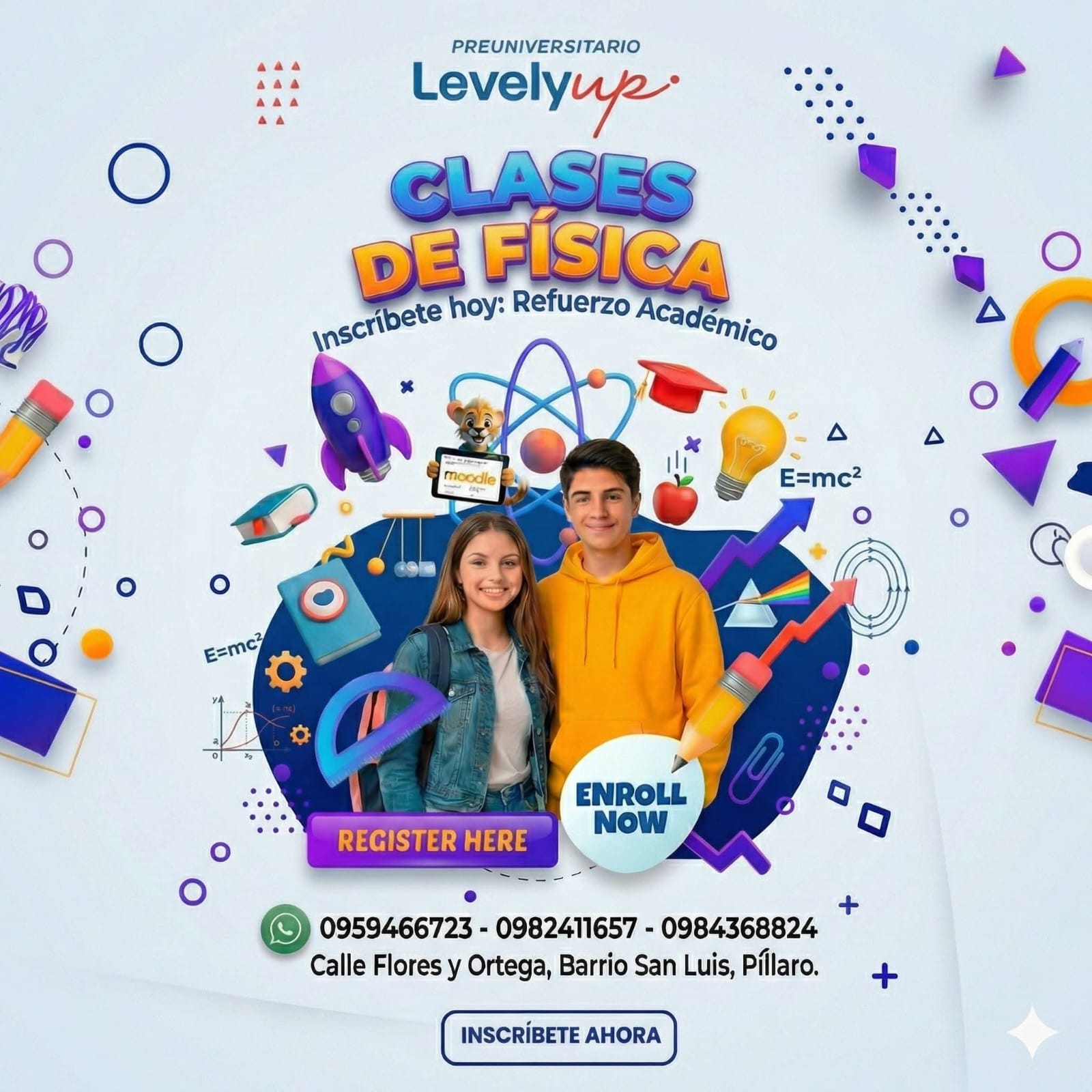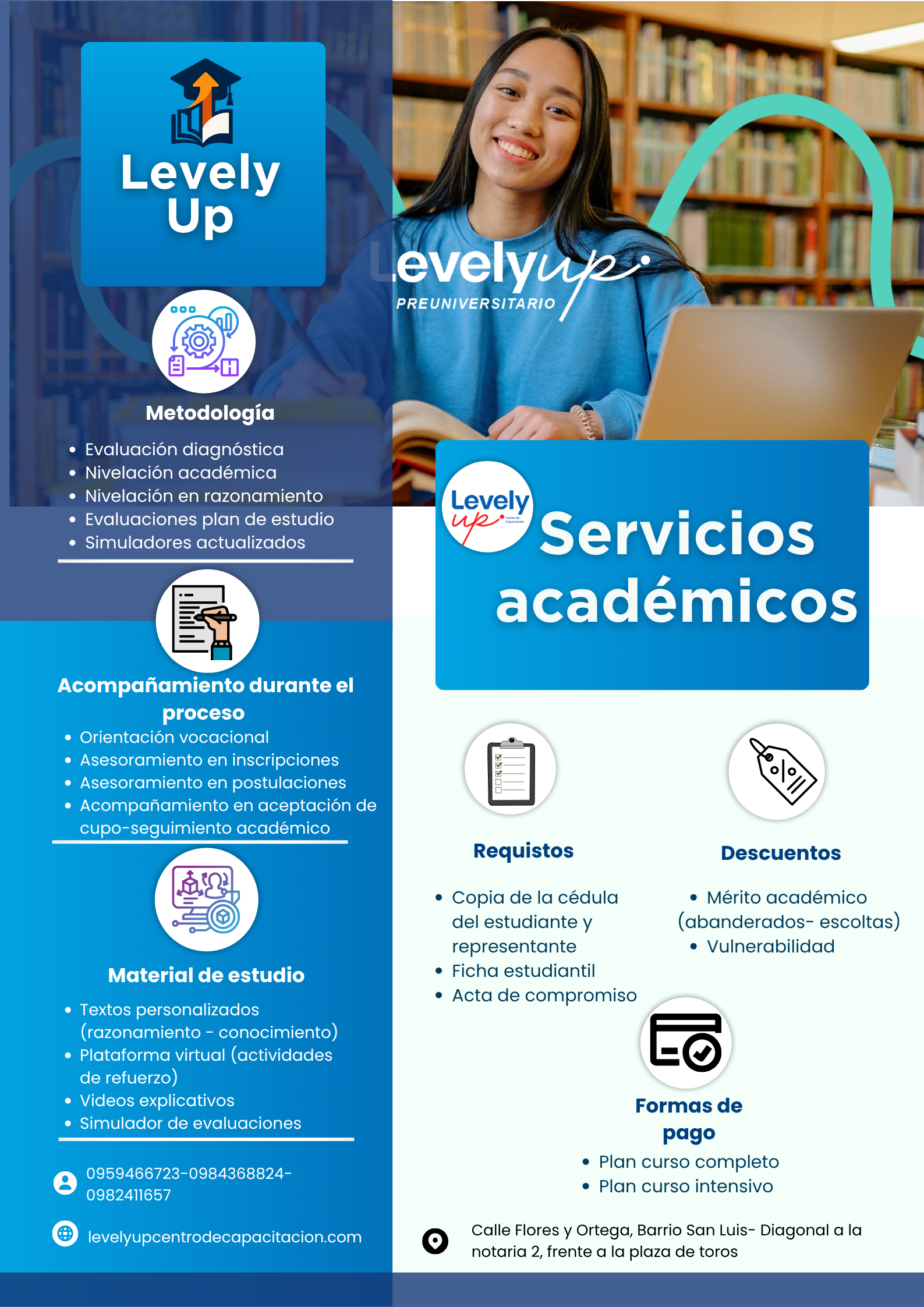 “En Levely Up, tu camino al éxito académico empieza aquí. Somos un centro de capacitación enfocado en potenciar tus habilidades a través de programas preuniversitarios, tareas dirigidas y certificaciones de excelencia. ¡Es momento de subir de nivel y empezar a construir tu propio camino!”